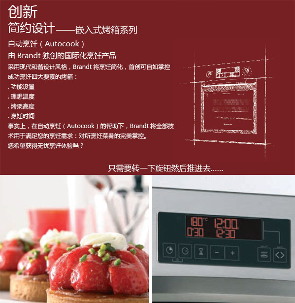 自动烹饪(Autocook)——事实上在自动烹饪的帮助下,Brandt烤箱将全部技术用于满足您的烹饪需求,对所有菜肴的完美掌控,真正做到无忧烹饪。